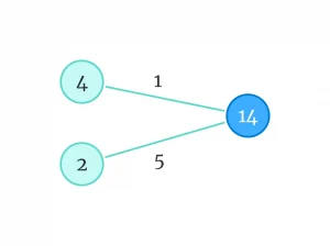 اما بیایید یک مرحله به عقب برگردیم. این بار برای سادهتر شدن شکل، علامتهای ضربدر و بهعلاوه را حذف میکنیم. اما یادمان میماند که اعداد ورودی (در اینجا ۴ و ۲) در وزنها، ضرب میشوند و حاصل آنها، با هم جمع میشود.