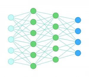 واقعیت این است که پرسپترونها به صورت انفرادی قدرت چندانی ندارند. قدرت آنها زمانی برملا میشود که اجتماع بزرگی از آنها بسازیم؛ یعنی به صورت مکرر، خروجی یک پرسپترون را به عنوان ورودی به یک پرسپترون دیگر بدهیم. مثلا شبکه زیر را در نظر بگیرید؛ این شبکه ۴ لایه است و بدون در نظر گرفتن لایههای ورودی و خروجی، ۱۱ نورون دارد که با رنگ سبز نشان داده شدهاند.